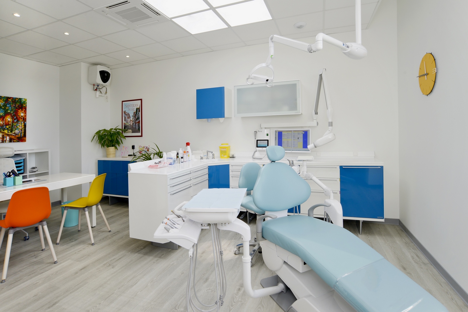 Au premier étage, l’aile droite est occupée par une salle de réunion et d’un logement permettant de loger les remplaçants. Sur l’aile gauche se trouvent les deux cabinets des dentistes.